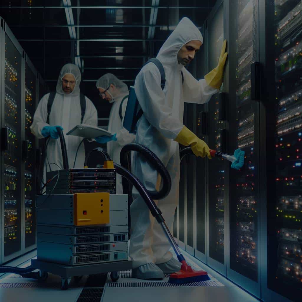 Dans le cadre du nettoyage d’un centre de données, des équipements spécifiques sont nécessaires pour éviter d’endommager les systèmes informatiques sensibles.
